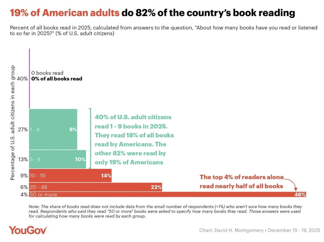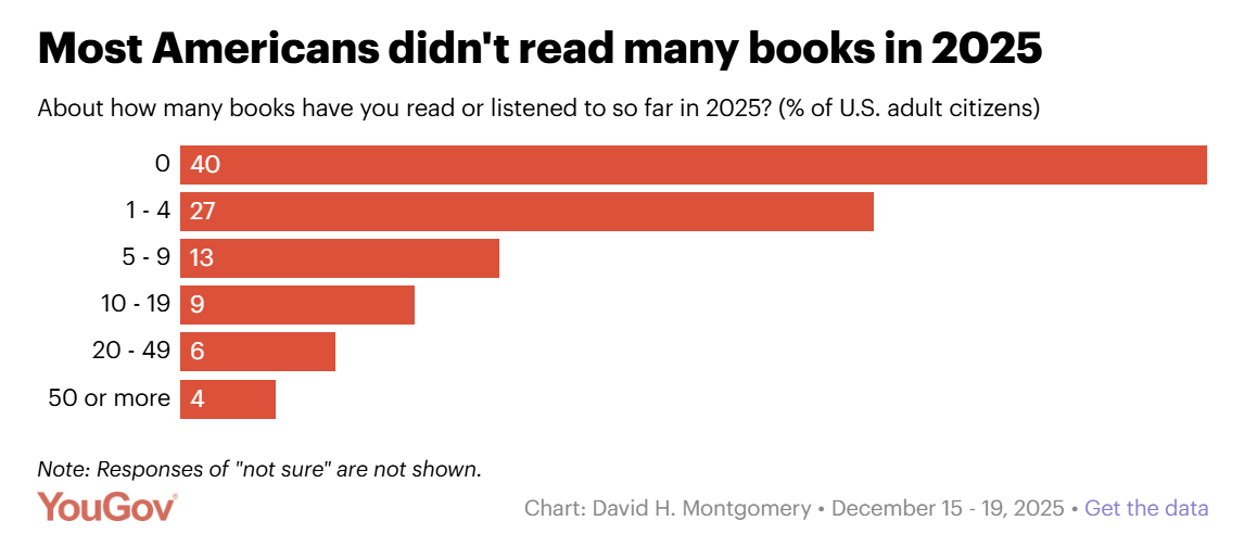 According to a new YouGov survey, 40% of Americans did not read a single book in 2025. Among those who did read, most finished only one or two books, while a small minority accounted for the bulk of all reading.