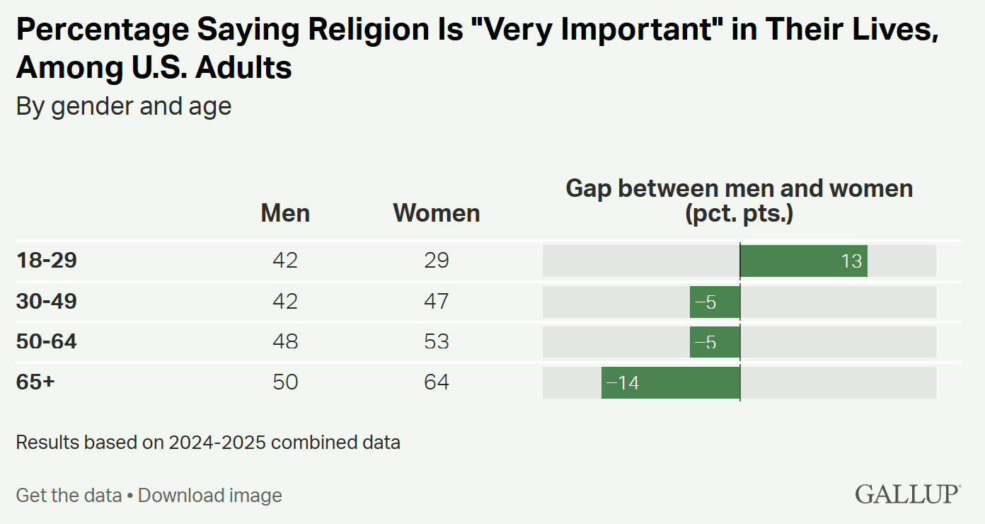 This surge in religion among young men stands in sharp contrast to young women. Just 29% of women ages 18–29 say religion is “very important” in their lives, a -3 percentage point decline since 2023. That leaves a striking 13-point gap between genders. In fact, young adults are now the only age group in which men report higher religious importance than women. This is a clear break from the historical norm, where women at every age have consistently expressed more interest in religion than men.
