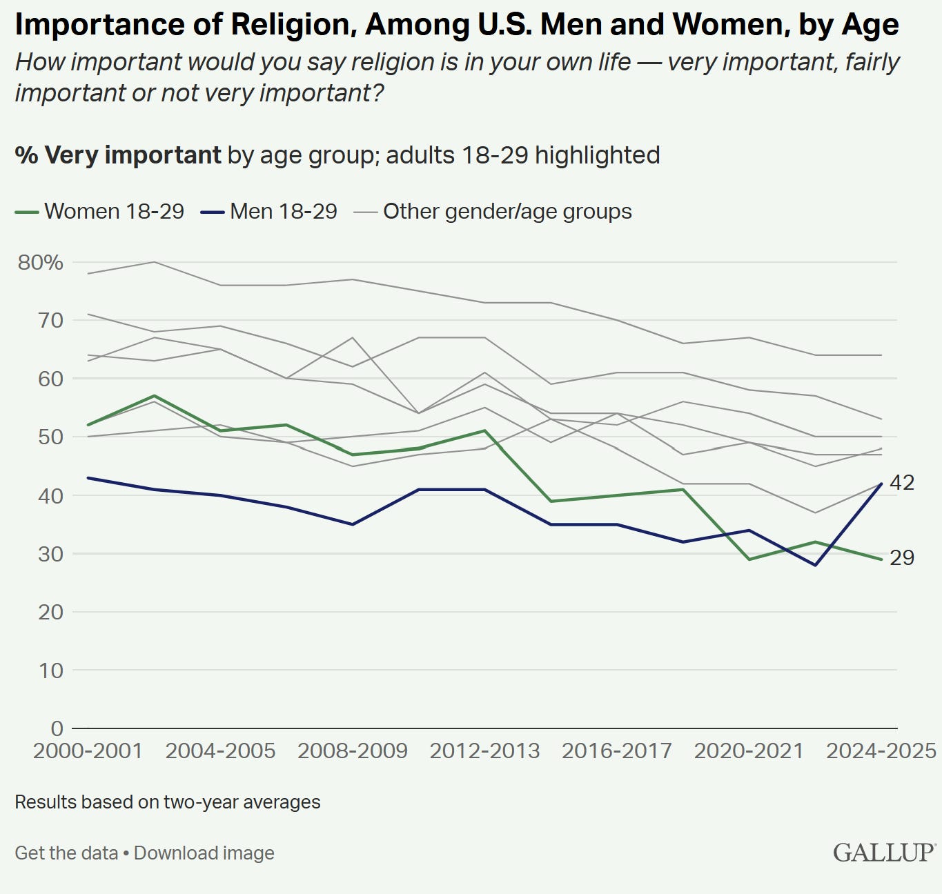 According to a new Gallup survey, in 2025, 42% of men ages 18-29 said that religion was “very important” in their lives. That’s a +14 percentage point increase since 2023, when only 28% said the same thing. Young men’s religiosity is nearly back to its 2001 level of 43%.