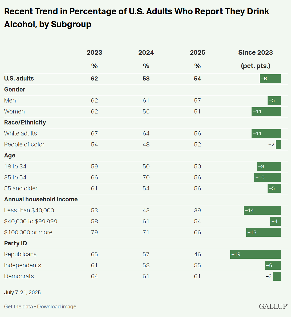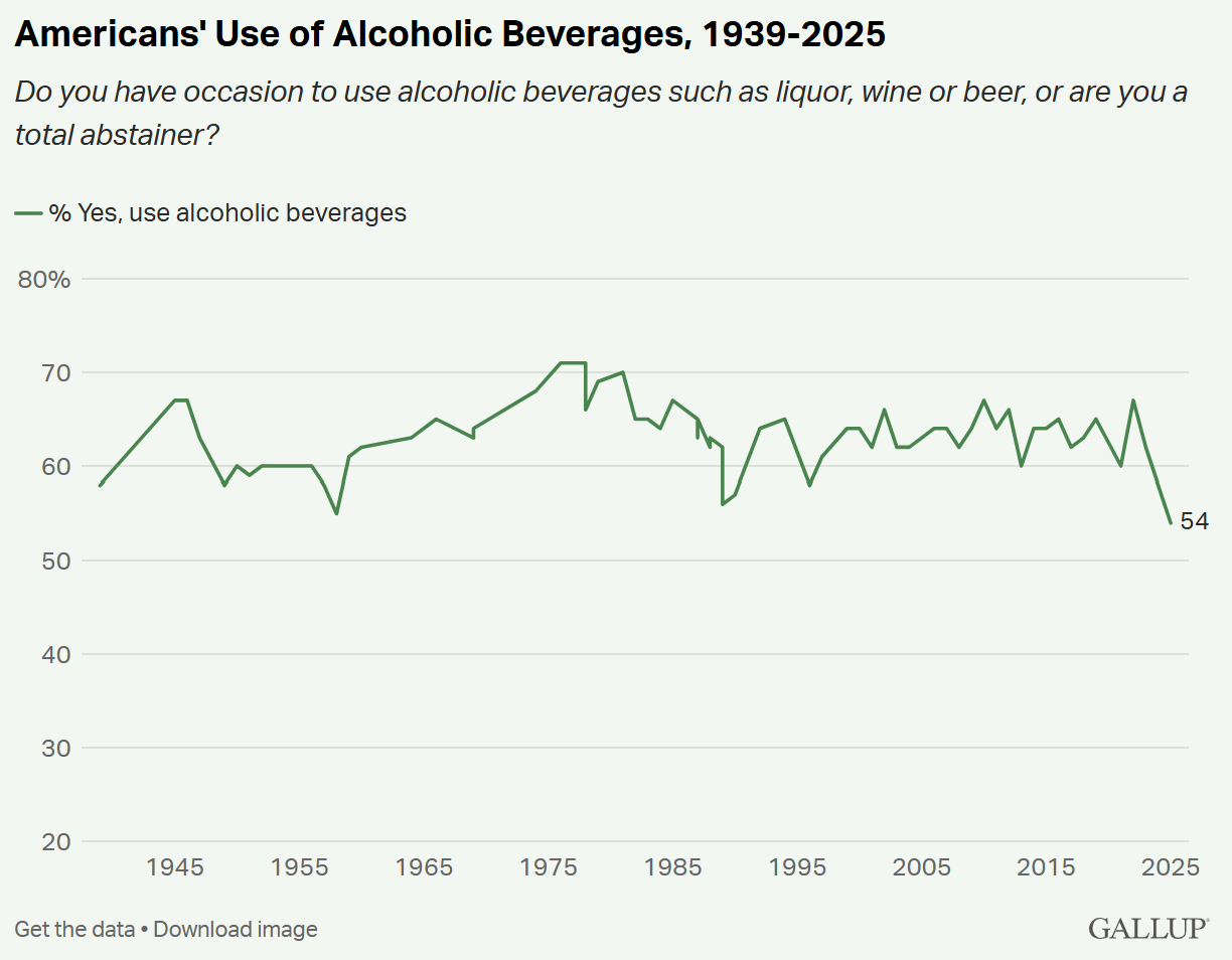 In 2025, only 54% of Americans say they occasionally drink alcohol. That’s a -4 percentage point decline since 2024, -9 percentage points below the historical average (1939-2024: 63%), and the lowest share that Gallup has ever recorded.