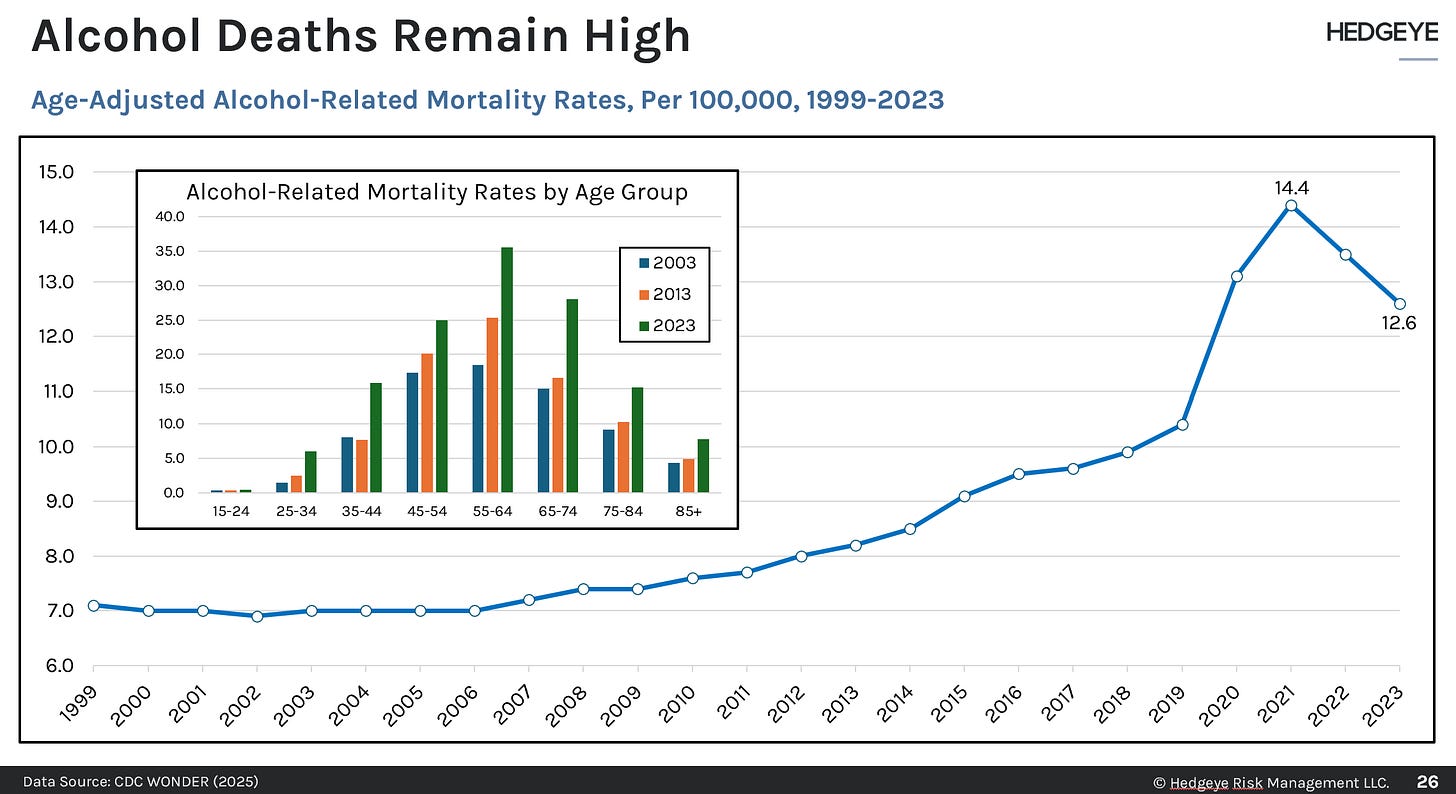 One reason to be a bit skeptical is that the alcohol-related death rate, while indeed down from its peak in 2021, was still very high for pretty much every age bracket in 2023. (This is the latest year for which the CDC has mortality data; see “2025 US Demography Review.”) Alarmingly, the death rate among 35-to 44-year-olds in 2023 was roughly double what it was a decade ago. Among 65-to 74-year-olds, it was up roughly 80%.