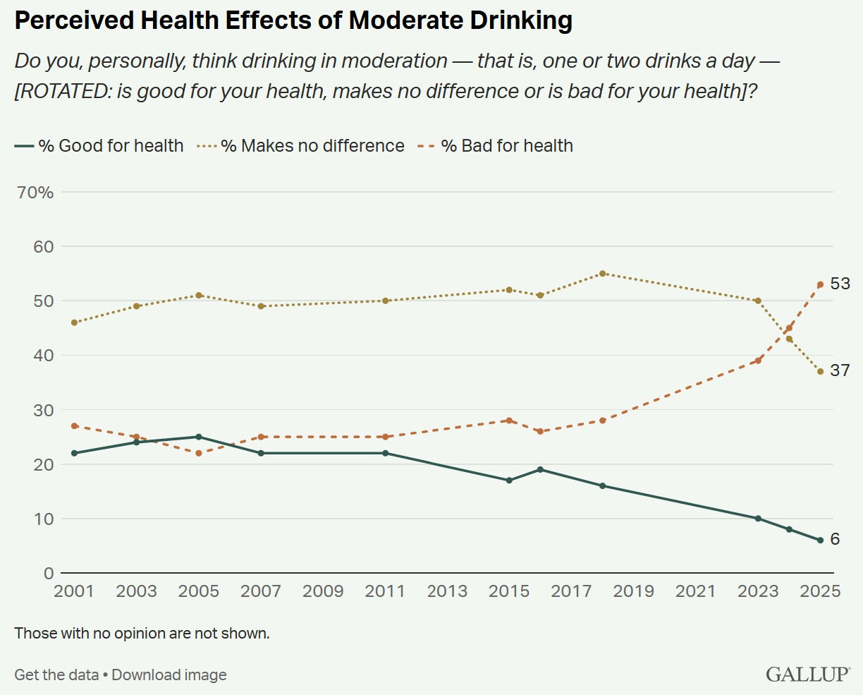 As for Republicans, their shift aligns with the White House’s “Make America Healthy Again” campaign. Neither Trump nor RFK Jr. drinks, and a record 53% of Americans now say even moderate drinking is bad for health. (See “Americans Grow Wary of Alcohol.”)