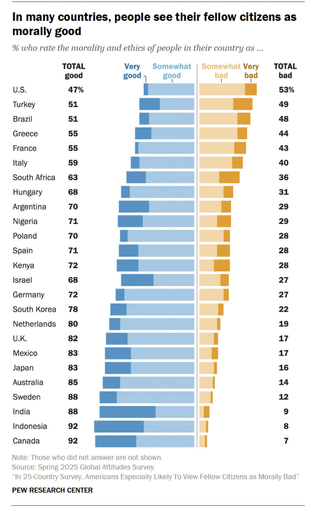 According to a new Pew survey spanning 25 countries, Americans are the most critical of their fellow citizens. Fully 53% of US adults say the morality and ethics of Americans are “somewhat or very bad.” That’s +25 percentage points above the cross-country median (28%). What’s more, the US is the only country where a majority believes their fellow countrymen are more bad than good.