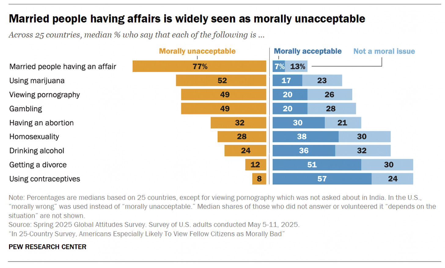 For example, 90% of Americans say extramarital affairs are morally wrong, +13 percentage points above the cross-country median (77%). 39% say homosexuality is immoral, +11 points above the median (28%). And 23% say getting a divorce is unacceptable, also +11 points above the median (12%).