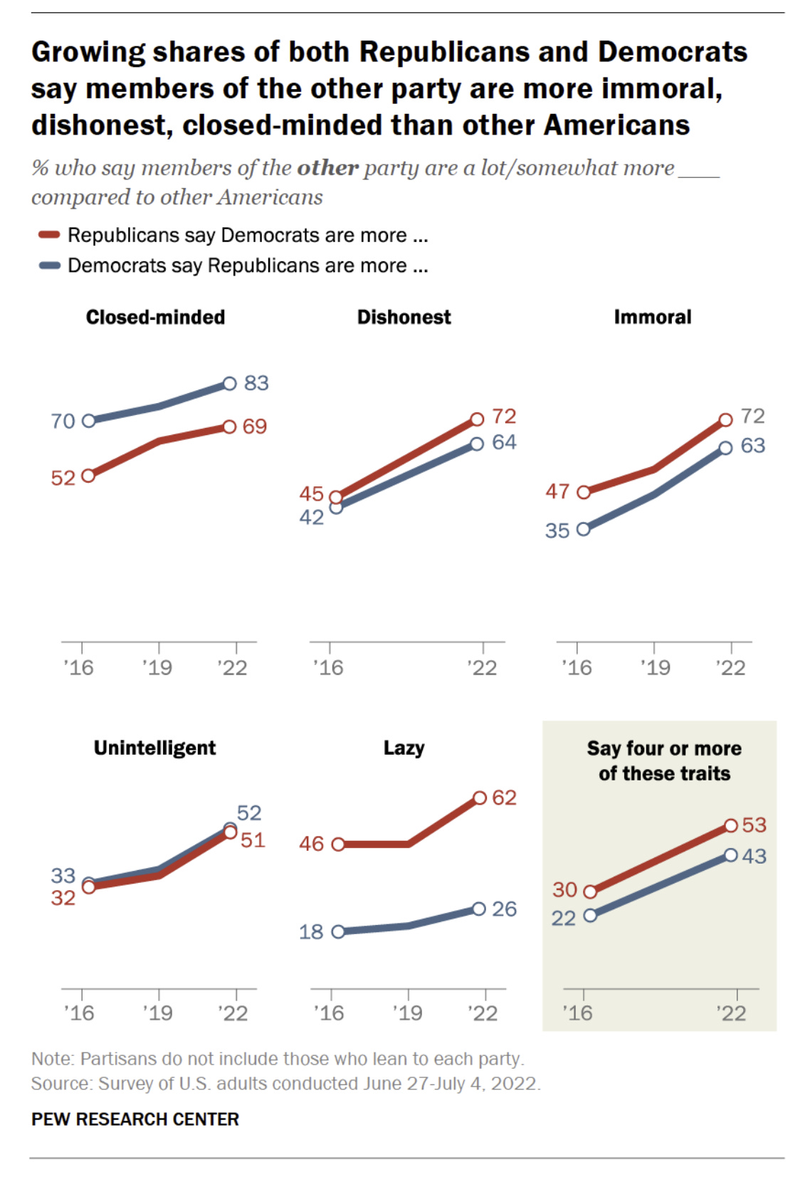 Between 2016 and 2022, the share of Republicans who say Democrats are immoral rose +25 points, to 72%. And the share of Democrats who say Republicans are immoral climbed +28 points, to 63%. Similar increases occurred in how each party demonizes the other: closed-minded, dishonest, unintelligent, and lazy.