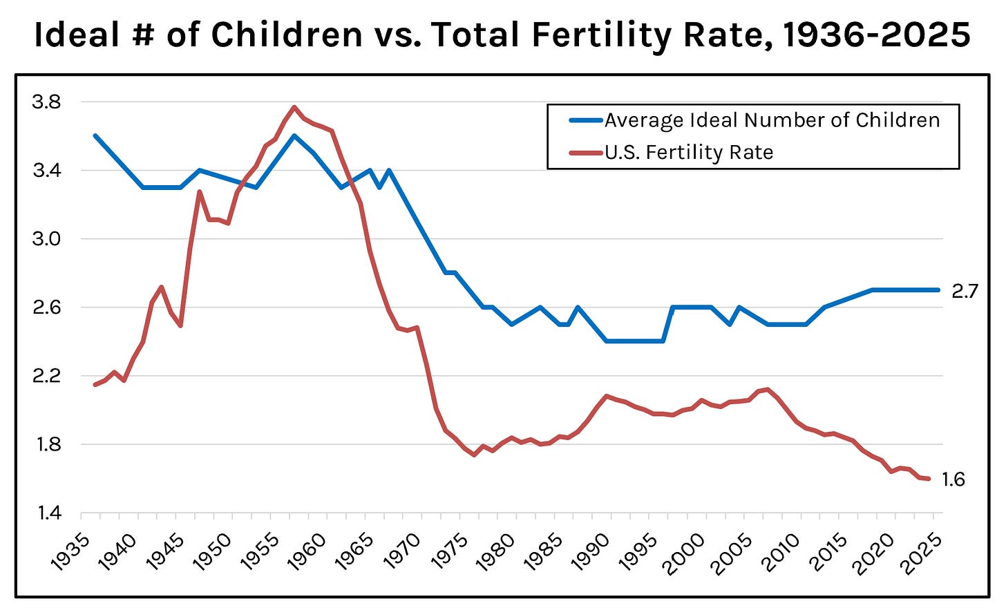 Since 1936, Gallup has asked Americans how many children they consider ideal. This summer, the answer reached 2.7, the highest in 50 years. But in reality, Americans are having far fewer children: The total fertility rate is just 1.6. That’s a record 1.1-child shortfall between aspiration and reality.