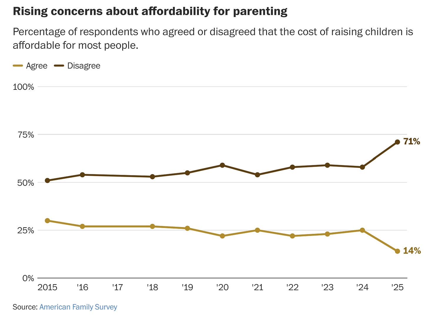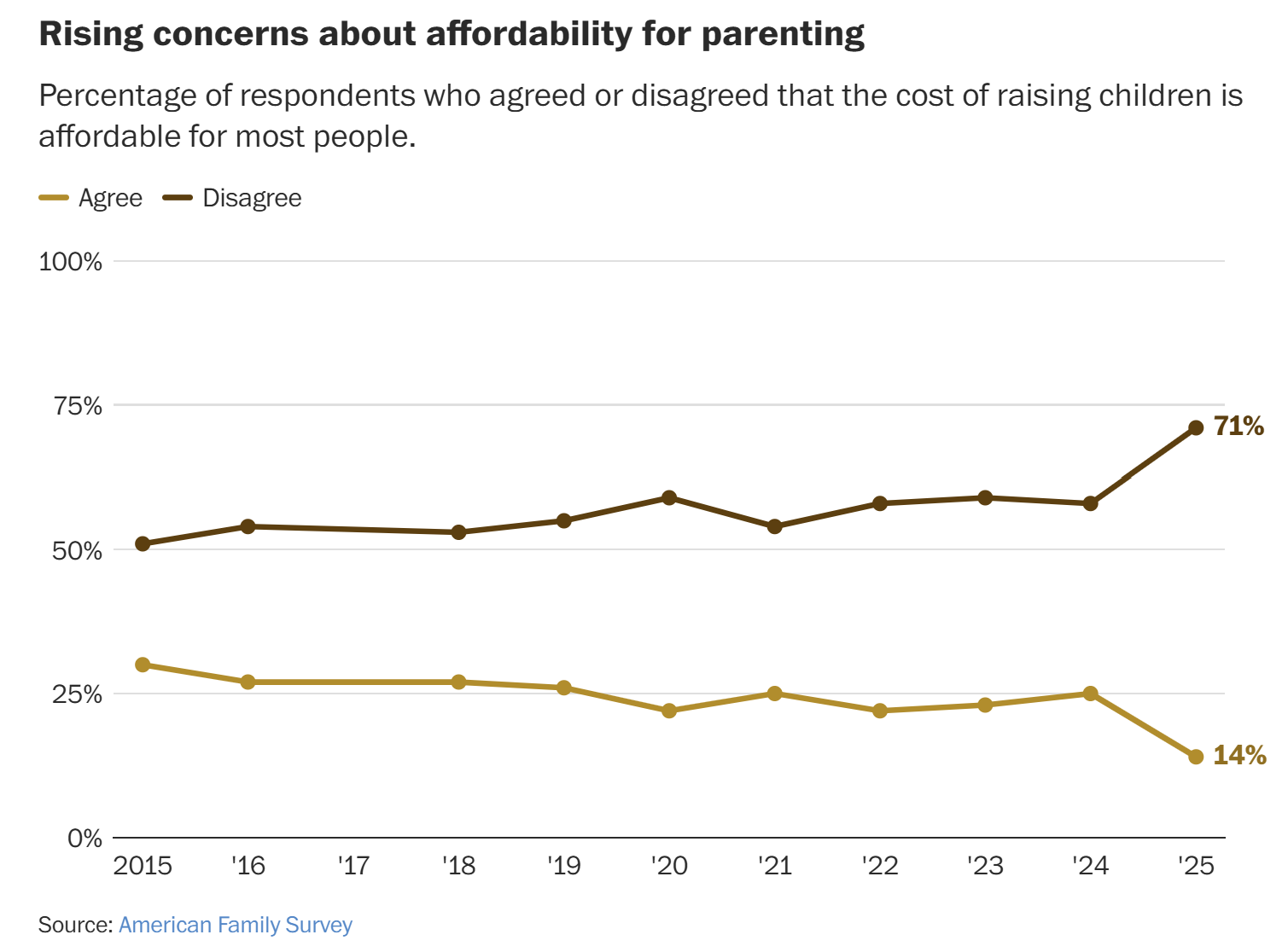 Moreover, the perceived affordability gap keeps widening. In 2015, 51% of US adults disagreed with the statement that “the cost of raising children is affordable for most people.” Today, that share has risen +20 percentage points to 71%.