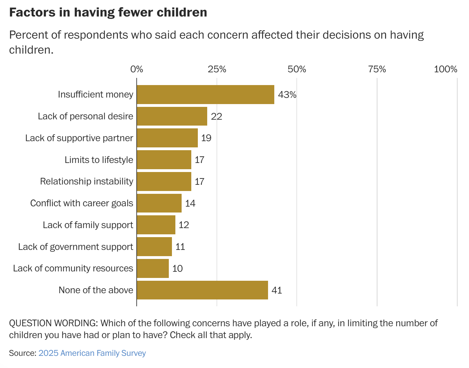 We’ve long argued that declining birthrates aren’t about Americans wanting fewer kids, but about Americans feeling less able to have them. According to the 2025 American Family Survey, 43% of respondents said insufficient money played a role in limiting their family size. Only 22% cited a lack of personal desire.