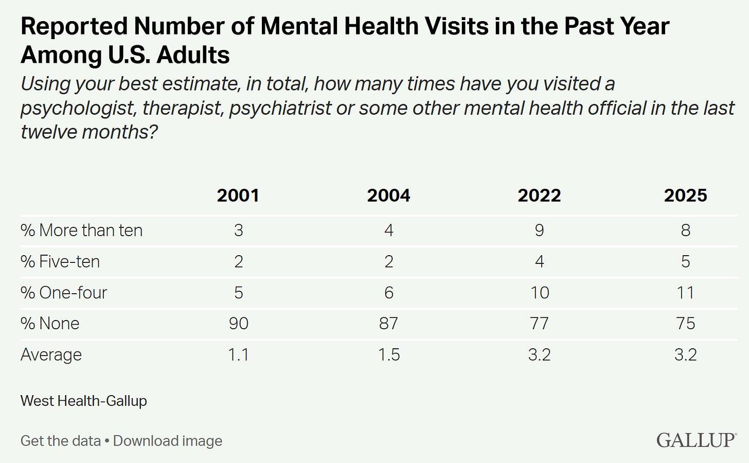 Over the past two decades, the share of Americans seeking professional help for their mental health has risen markedly. In 2001, just 10% of adults reported seeing a mental health professional. By 2022, that figure had climbed to 25%, where it has remained over the past three years. In other words, the recent deterioration in self-reported mental health has not been accompanied by a surge in doctor visits. At least, not yet.
