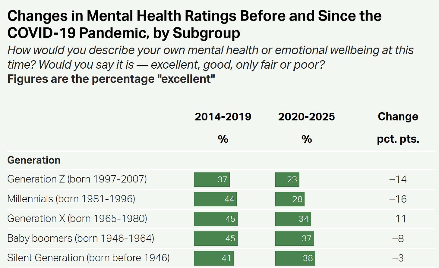 Over the past decade, mental well-being has declined across every demographic group, but the steepest drops have occurred among younger generations. The share describing their mental health as “excellent” has fallen -14 points among Gen Z-age youth and -16 points among Millennial-age young adults.