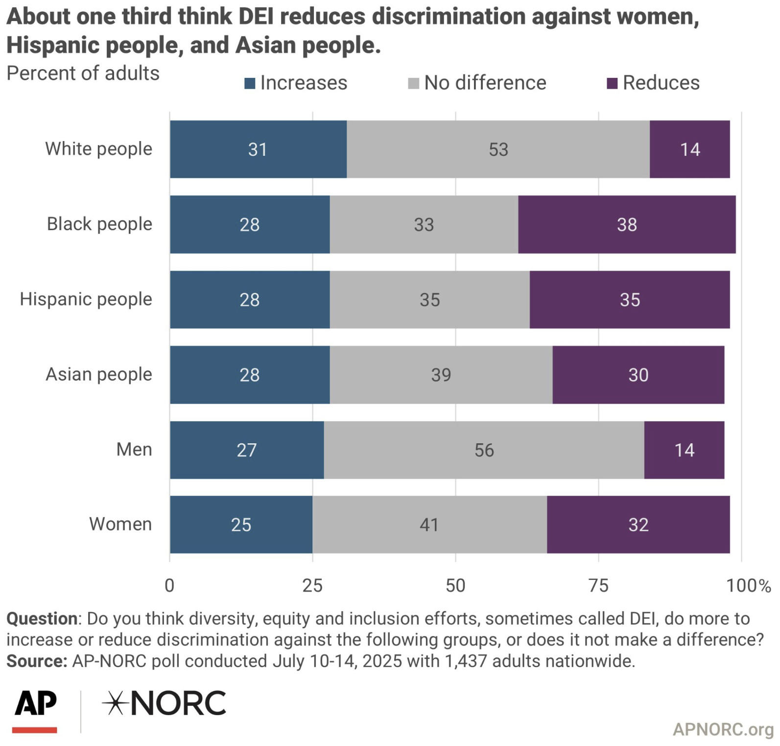The backlash isn’t coming from Trump alone. Public sentiment appears to be shifting too. A July AP-NORC poll found that more than half of U.S. adults now believe DEI programs either make no difference or actually increase discrimination. Meanwhile, just 45% say black Americans face “a great deal” or “quite a bit” of discrimination, a 16-point drop since 2021. (See “Support for DEI Declines.”)