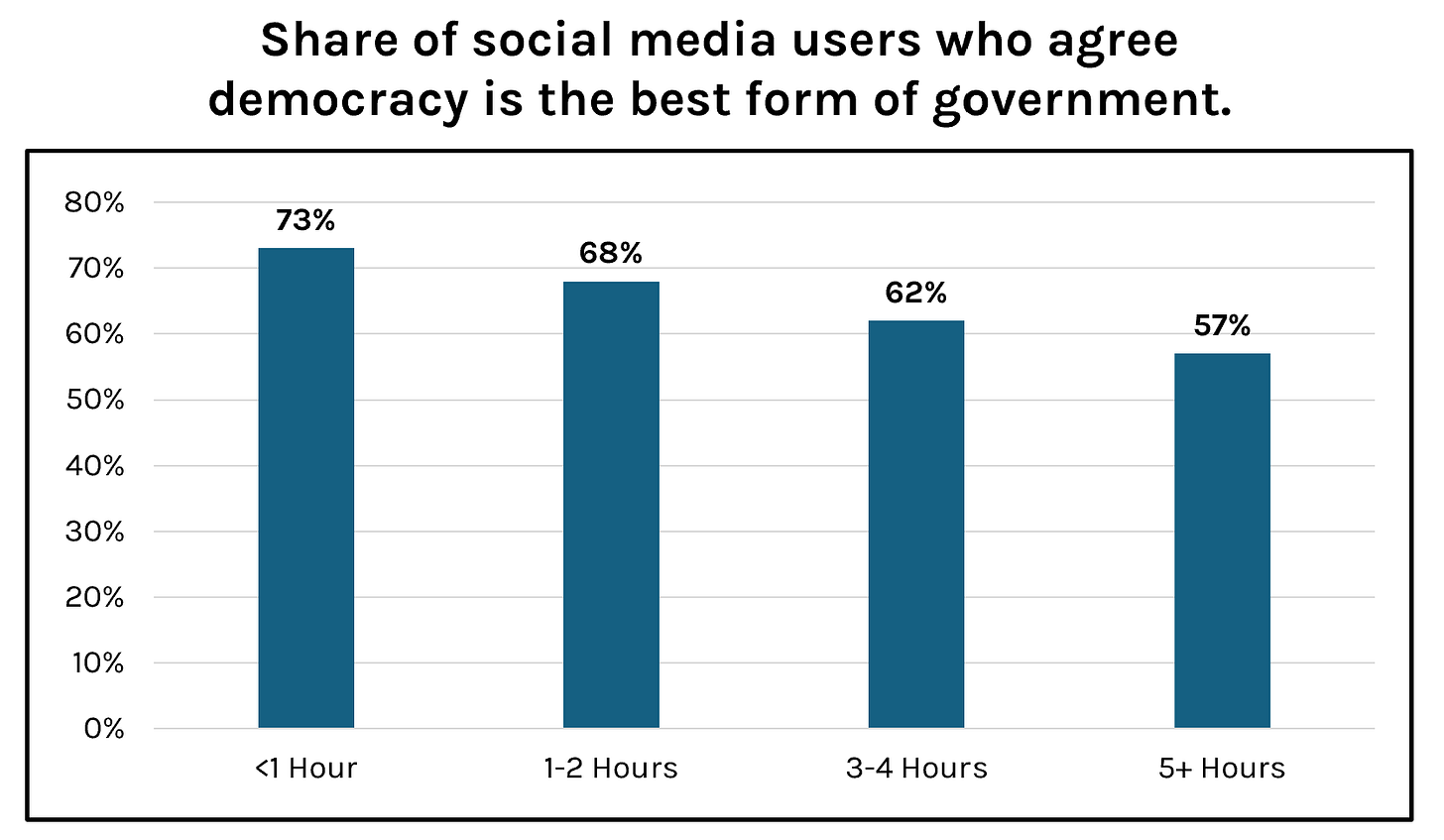 The divide is most visible in views on democracy. Among adults who spend an hour or less per day on social media, 73% say democracy is the best form of government. But among those who scroll for five or more hours, only 57% say the same. That’s a whopping 16 percentage point difference.