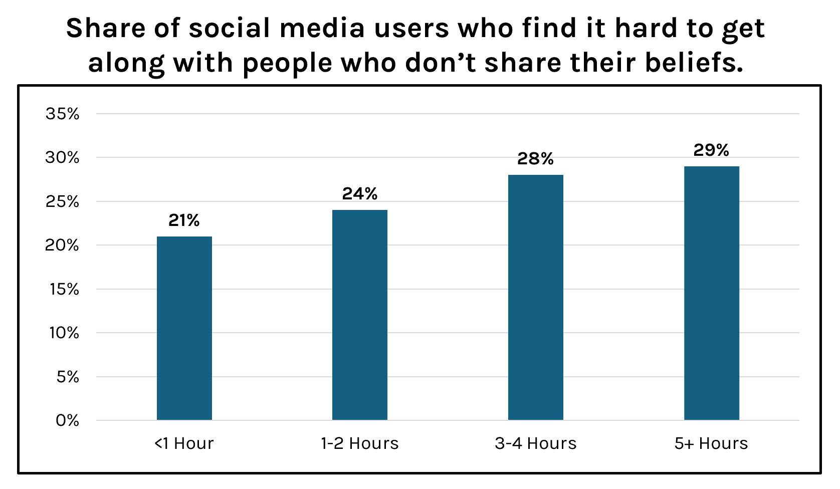 Heavy social media usage is also linked to greater tribalism. Just 21% of light users say they find it hard to get along with people who don’t share their beliefs, compared with 29% of heavy users. That’s an 8-point gap.