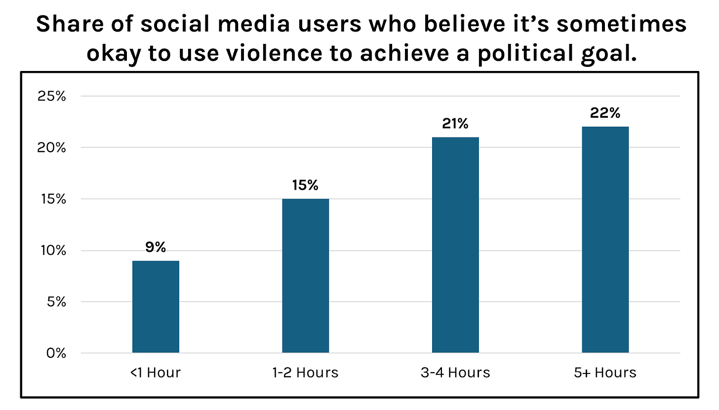 Most striking is the split in attitudes toward political violence. Only 9% of light users say it is sometimes acceptable to use violence to achieve political goals, versus 22% of heavy users. That’s a 13-point difference.