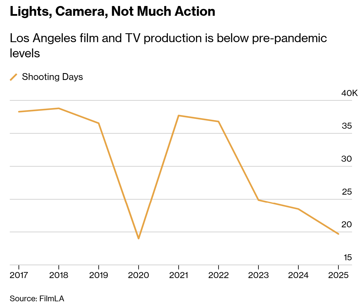 Hollywood is also spending far less on film production. According to FilmLA, filming permits in Los Angeles County totaled just 19.7K in 2025, down -49% from 2018 and roughly on par with 2020, when the world shut down due COVID-19. Part of the decline reflects productions moving out of California to cheaper locations. But it also reflects a broader shift in media spending, as studios redirect more of their budgets toward live programming, especially sports.