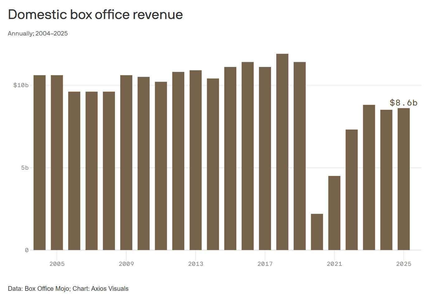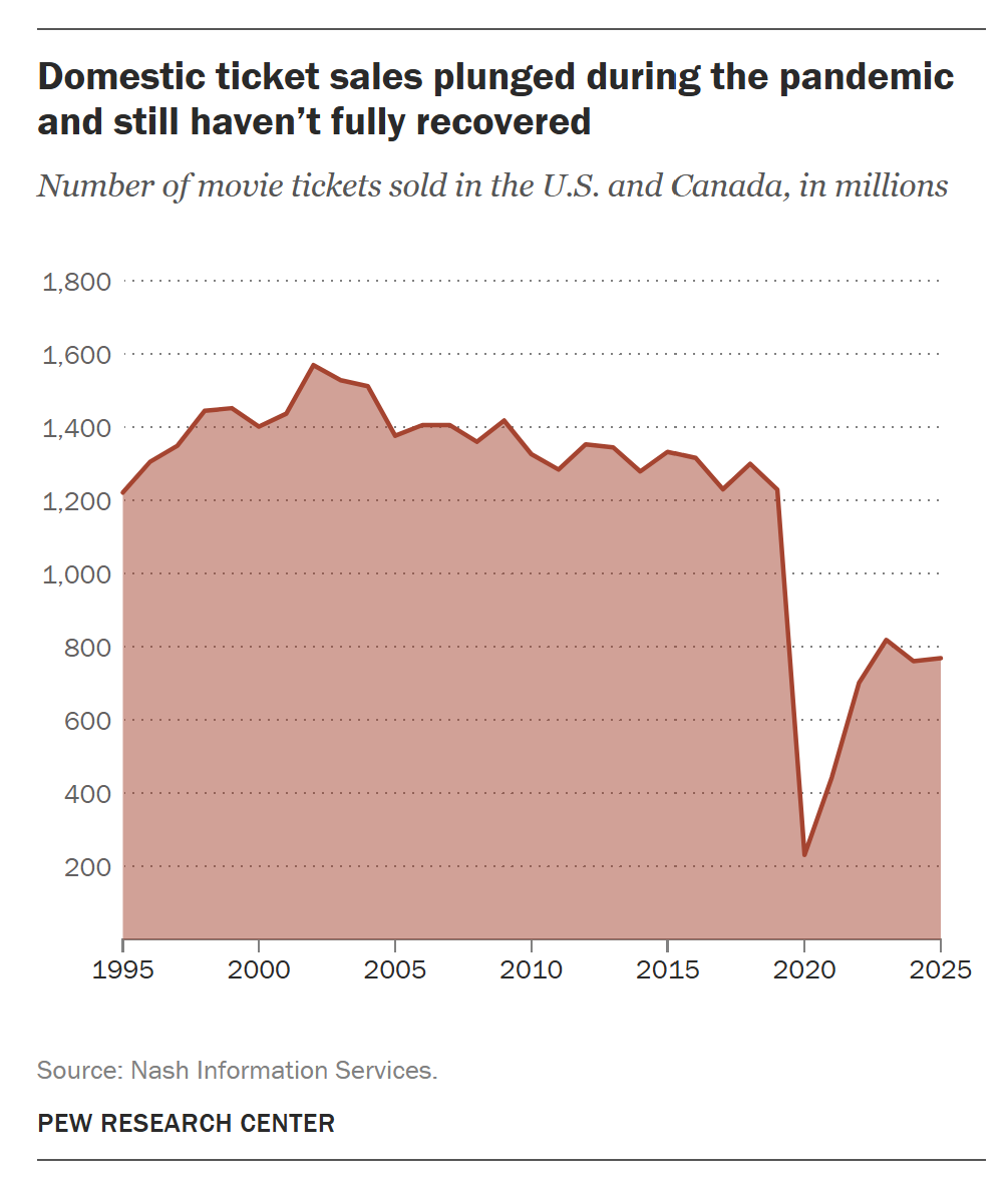 Nearly six years after the pandemic, theaters remain a shadow of their former selves. In 2025, the domestic box office totaled just $8.6 billion, down -3% from 2023 and -24% from 2019.