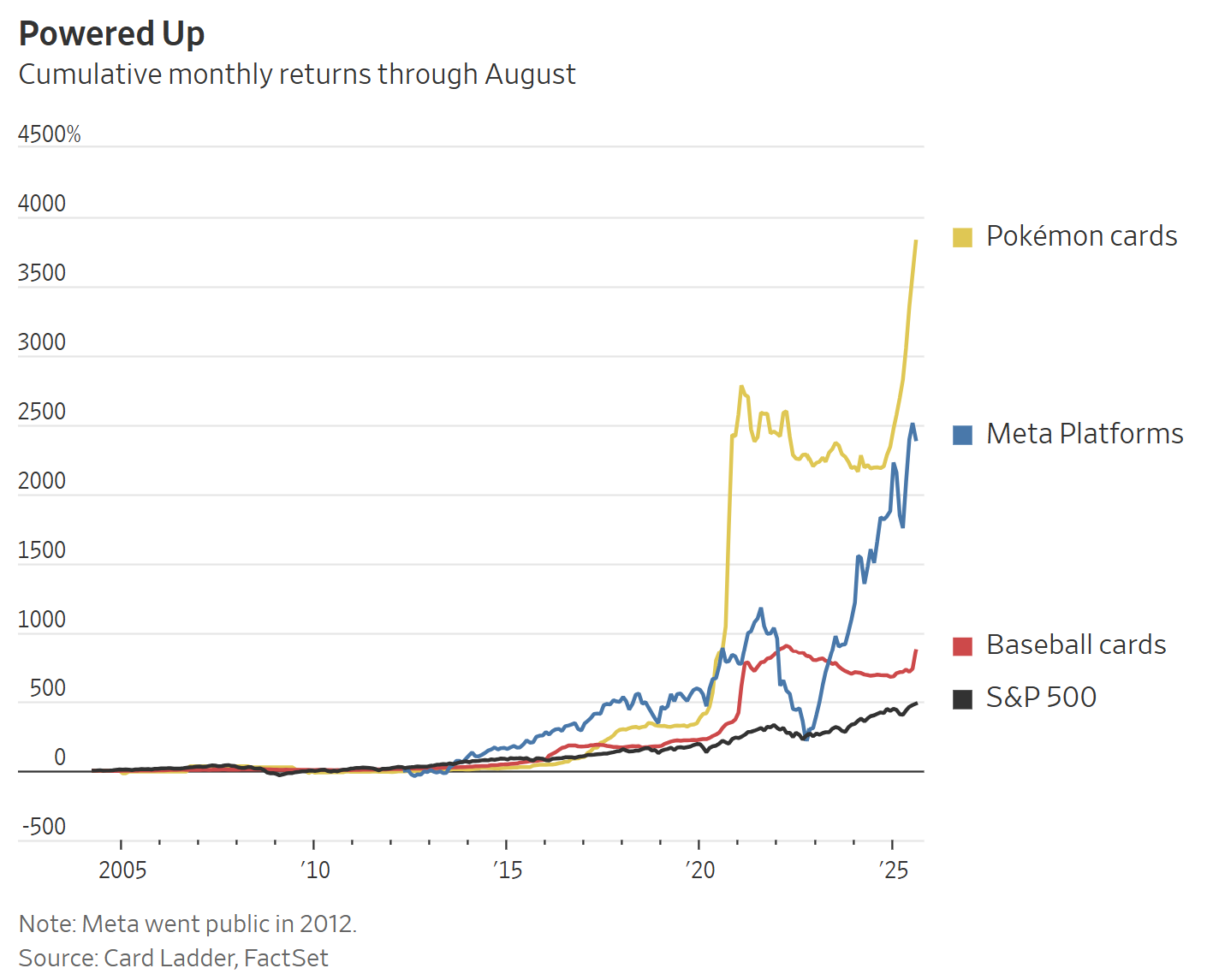 Lotto Tickets. A growing share of buyers treat trading cards as speculative assets, hoping to pull rare hits they can resell at a profit. Since 2004, Pokémon cards have delivered a cumulative monthly return of +3,821%. And some brands now design for scarcity. Magic: The Gathering famously printed a single “One Ring” card for its Lord of the Rings series; Post Malone bought it from a lucky fan for $2 million.
