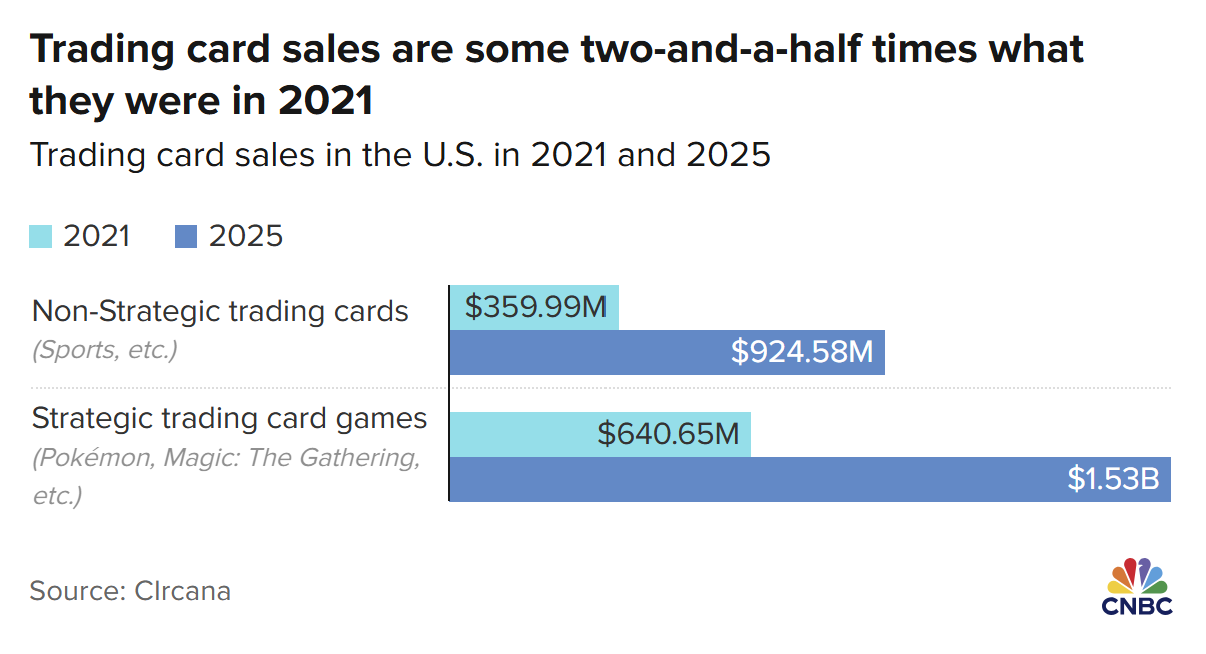 According to market researcher Circana, the trading-card market in 2025 will be about two-and-a-half times the size it was in 2021. Strategic trading card games, such as Pokémon and Magic: The Gathering, are expected to rise from $641M to $1.53B, a +139% jump. And non-strategic trading cards, like sports cards, are expected to surge from $360M to $925M, a +157% jump. The two core demographics driving the boom are Homelanders and late-wave Millennials, ages 8 to 28.