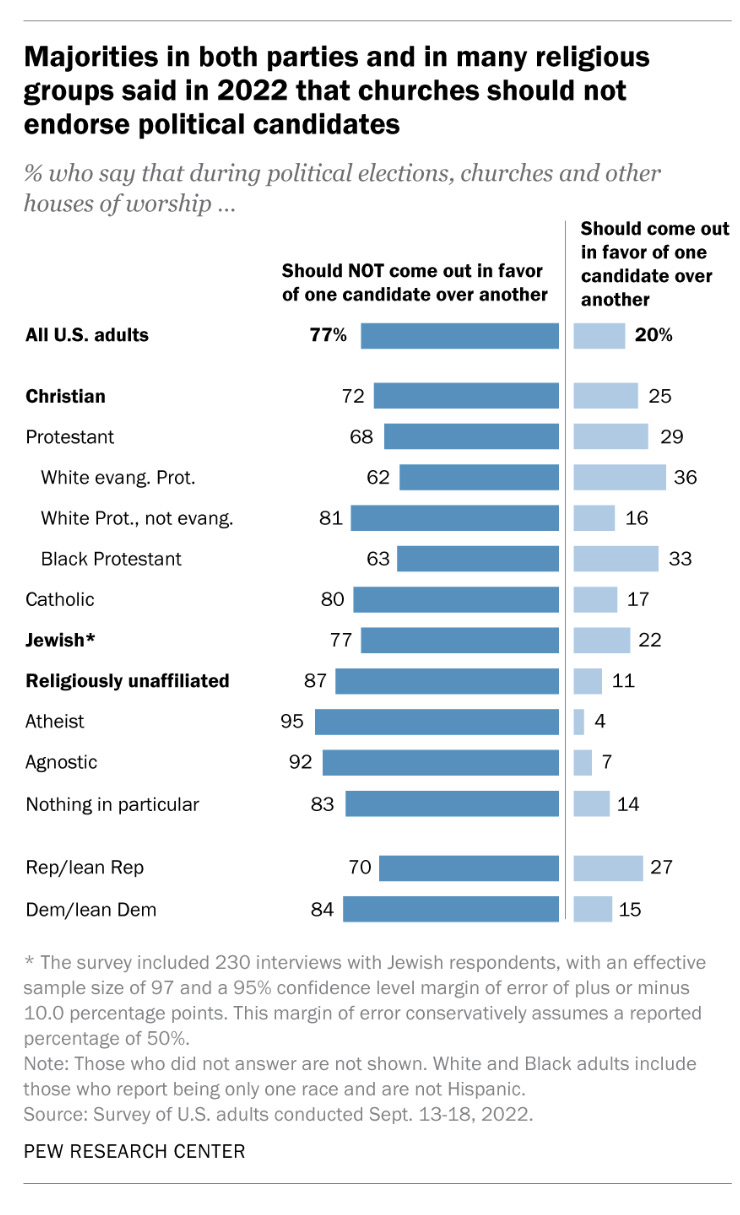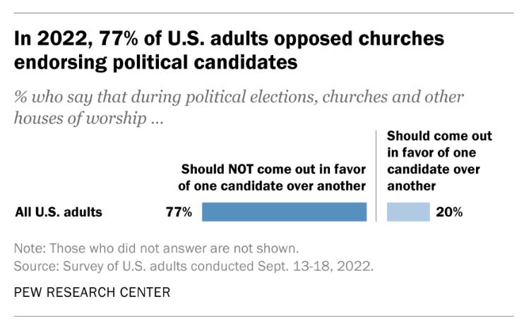 It’s worth noting that Pew asked whether churches should endorse candidates—not whether they should be allowed to. Many Americans may personally oppose endorsements from the pulpit while still supporting churches’ legal right to make them.