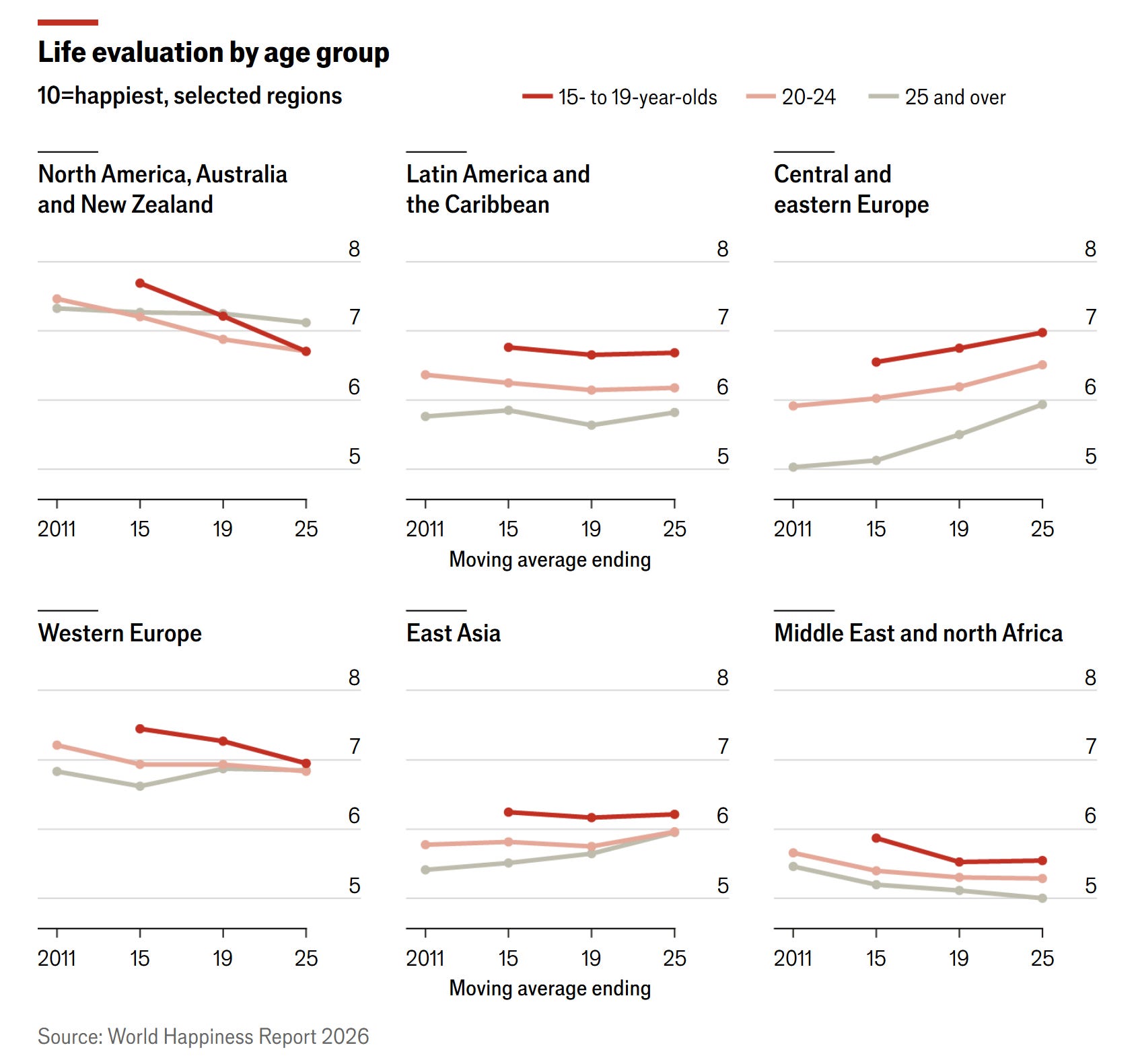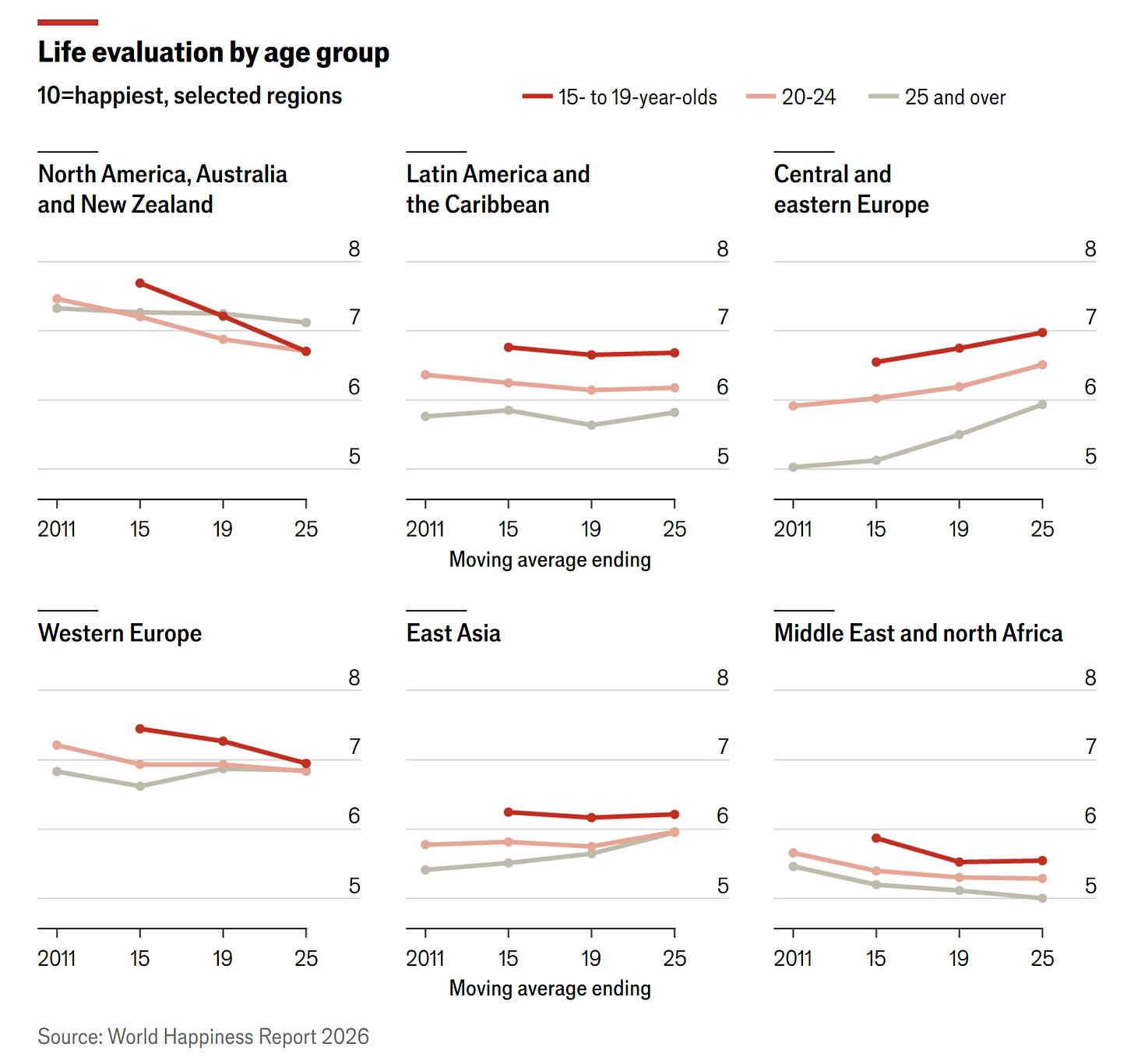 This decline in Anglosphere life satisfaction is concentrated among younger generations. Among those under 25, the six largest declines in happiness since 2011 have all occurred in English-speaking countries.