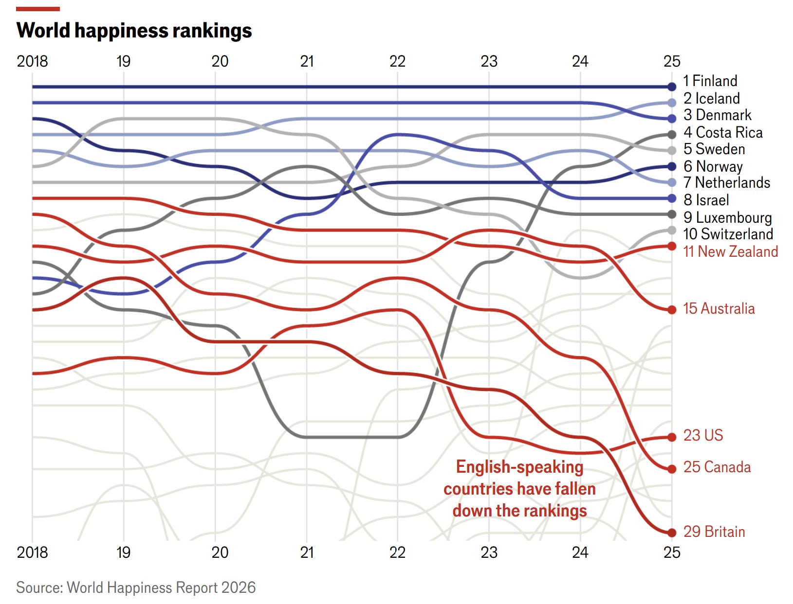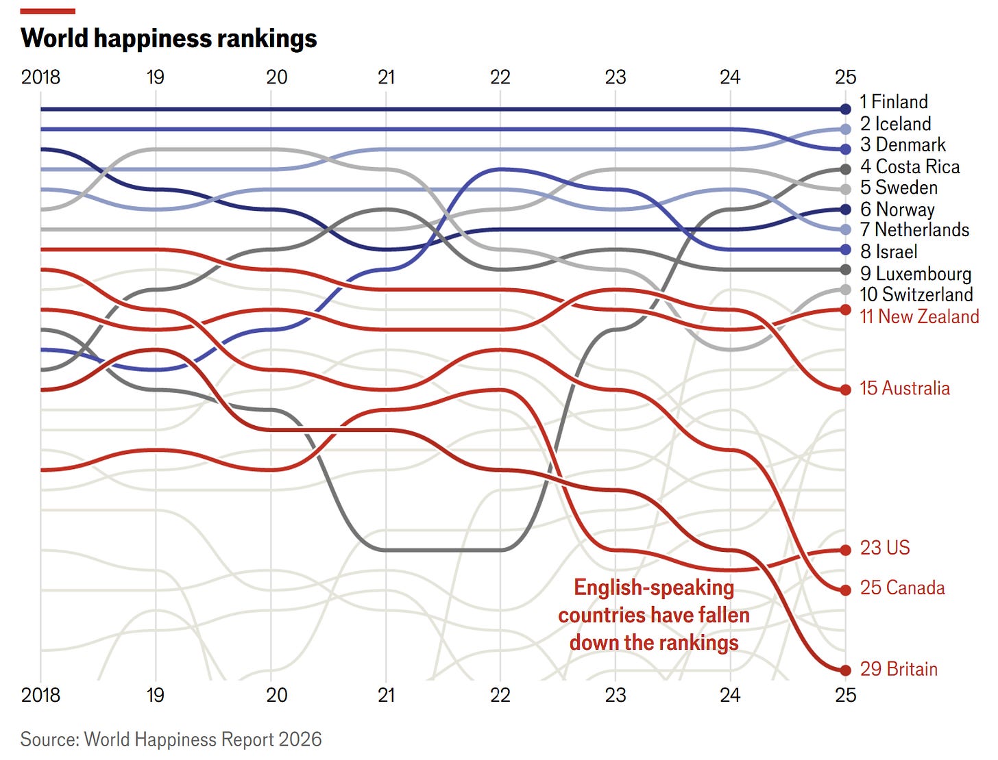The world is getting happier, but not the English-speaking world. While global life satisfaction has improved, the Anglosphere is falling behind due to rising pessimism among younger generations.