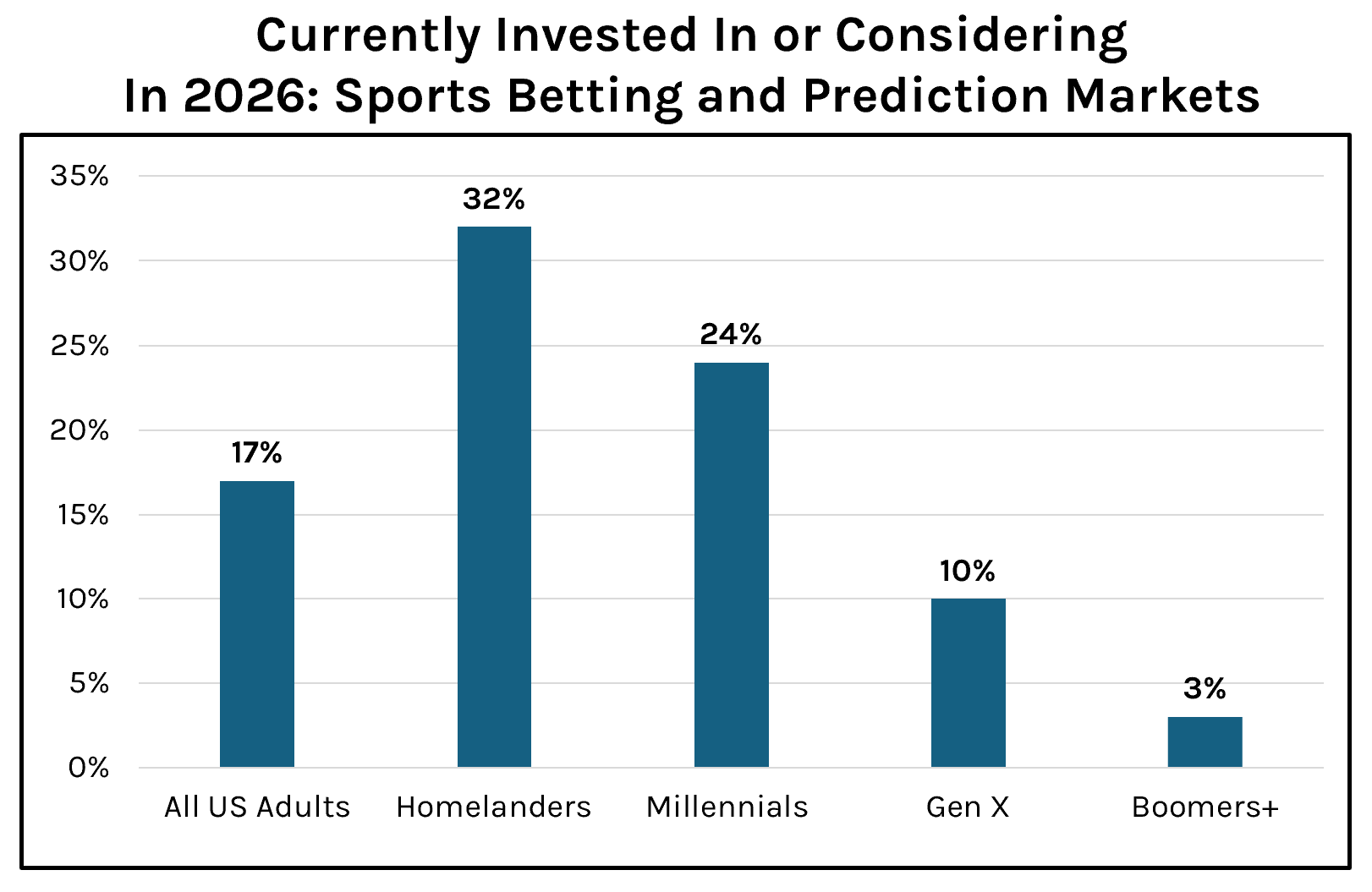 The gap is even larger in sports betting and prediction markets. Some 32% of Homelanders participate, compared with 17% of all US adults. That’s a difference of +15 percentage points. And that gap may be widening.