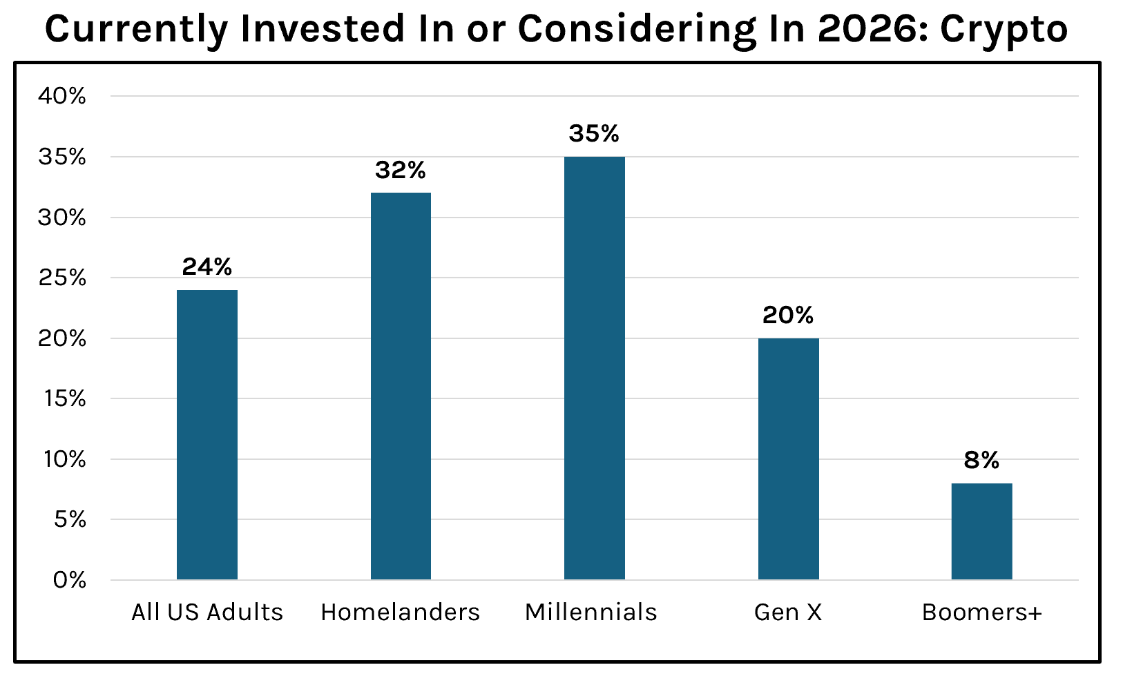 According to a new survey by Northwestern Mutual, young adults are far more likely to dabble in speculative assets than older generations. For example, 35% of Millennials and 32% of Homelanders are invested in crypto or plan to do so in 2026, compared with 24% of all adults. That’s a gap of +11 and +8 percentage points, respectively.